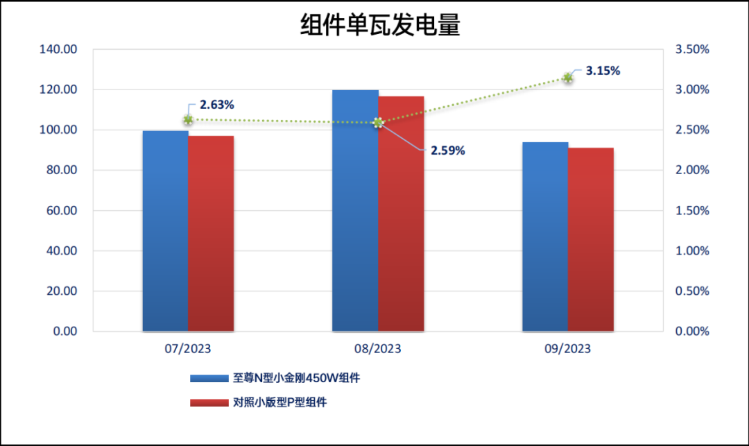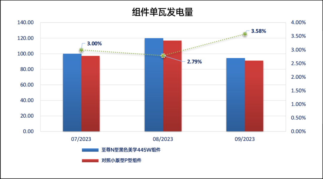 至尊N型小金刚450W组件和黑色美学445W组件累计单瓦发电量分别高出2.77%和3.09%,为用户带来更高的发电量,从而带来更高的收益,创造更高的价值。