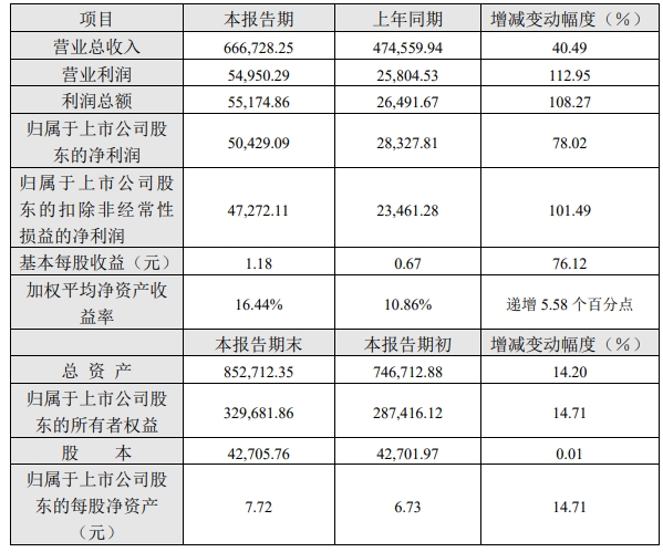 6、报告期内,基本每股收益同比增长 76.12%,主要原因是:归属于上市公司股东的净利润同比增长 78.02%。