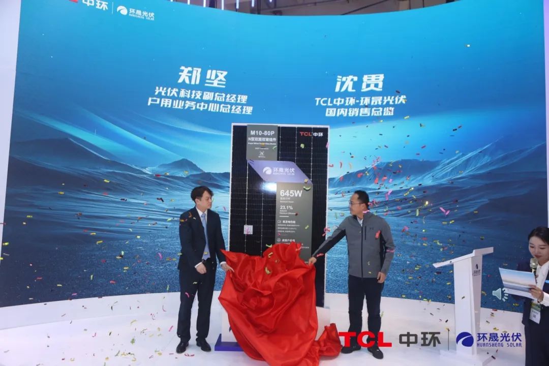 发布会上,TCL光伏科技副总经理、户用业务中心总经理郑坚与TCL中环-环晟光伏销售总监沈贯上台为新品组件揭幕,台下来自光伏行业的专家、客户及专业观众们共同见证了这一重要时刻。