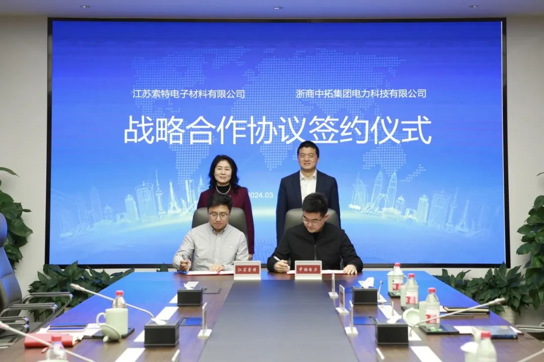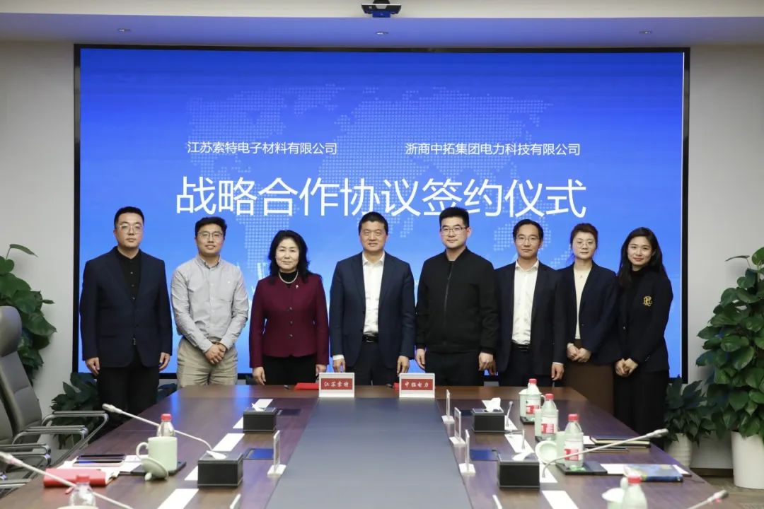 3月1日,江苏索特电子材料有限公司(以下简称“江苏索特”)总裁褚茜一行到公司走访交流。公司党委书记、董事长袁仁军,党委委员、副总经理、新能源事业部总经理徐剑楠及相关人员热情接待。双方深入沟通交流,探讨行业发展,加强务实合作,签订总经销商战略合作协议。