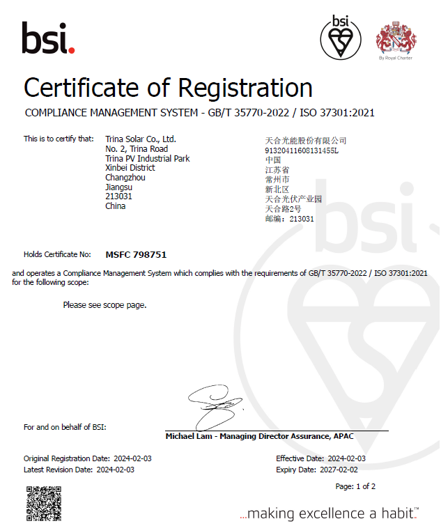冠压群芳!天合光能获得BSI颁发的ISO 37301合规管理体系认证证书