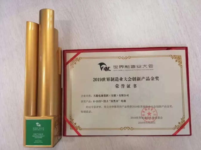 9月20日,2019世界制造业大会在合肥举行,来自78个国家和地区的4500多位境内外嘉宾出席大会。开幕式上“2019世界制造业大会创新产品金奖”等名单正式公布并颁奖。天能电池集团(安徽)有限公司的6-DZF-22.3真黑金电池,从全国参评的产品、服务和解决方案中脱颖而出,荣获绿色节能类“创新产品金奖”。
