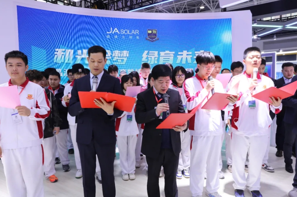 在签订备忘录后,来自晶澳科技与康福国际学校凯博学校的代表共同诵读了《全球绿色工商低碳发展倡议书》,以铿锵有力的声音向全社会传递出双方对清洁能源和可持续发展的坚定信念。