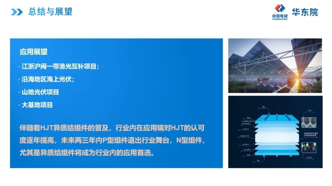 电建华东院杨翁经理从大型项目应用角度出发,认为异质结具备了行业内量产最高的转换效率和行业内量产最低的效率衰减,因此在沿海地区或者海上光伏项目中,可在有限的土地中安装更多的异质结光伏组件,不仅有效节约土地、支架等成本,而且在年均发电量上领先。展望未来,杨翁经理相信N型组件,尤其是异质结组件将成为行业内的应用首选,行业内在应用端对异质结的认可度会快速提升。