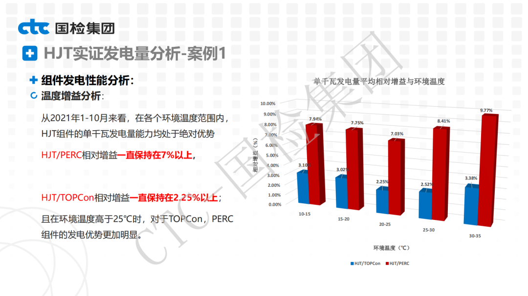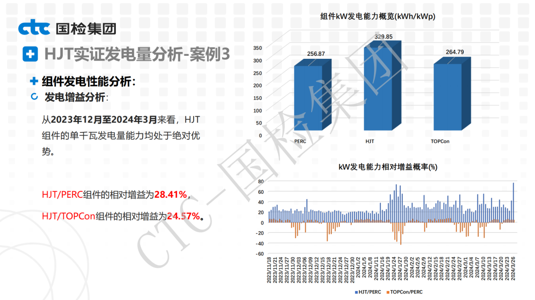 国检集团光伏检验认证院张洋总监则从实证角度出发,通过3组海南案例展现了异质结特别在高温高湿环境下的优越之处。从2021年1-10月、2023年3月至2024年3月、2023年12月至2024年3月这3组数据来看,在各个环境温度范围内,异质结组件的单千瓦发电量能力均处于绝对优势;且得益于-0.24%/℃的温度系数,异质结在处于高于25℃的环境时,对于TOPCon,PERC组件的发电优势更加明显。