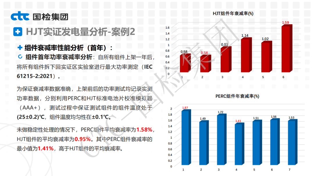 在2023年3月至2024年3月案例中,异质结组件的衰减表现也令人惊喜。在发电首年,异质结组件的平均衰减率为0.95%,而PERC组件的平均衰减率则达到了1.58%,平均衰减率相差将近0.6%。在第2年,二者数据分别为0.28%和0.69%,相差将近0.4%。