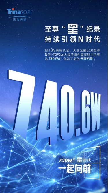 近日,天合光能光伏科学与技术全国重点实验室宣布,其自主研发的210+N型i-TOPCon光伏组件,经权威第三方检测认证机构TÜV南德认证,最高输出功率达740.6W,创造了新的世界纪录!