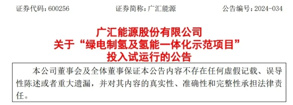 4月26日,广汇能源(600256)发布公告,披露广汇能源股份有限公司(简称“广汇能源”)的“绿电制氢及氢能一体化示范项目”已经投入试运行。