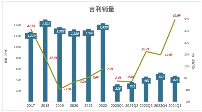 吉利将2024年销量目标定为190万部。一季度销量达47.6万辆、同比增长49.5%,完成全年销量25%(2023年Q1只完成年销量目标的19.3%)。