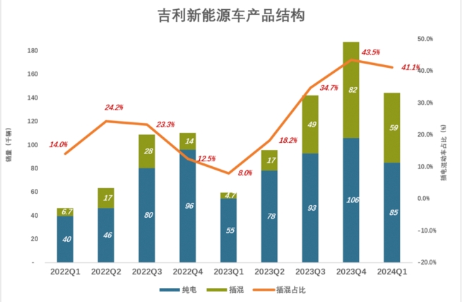 2024年Q1,插混销量达5.9万、同比增长1152%,占比41.1%。