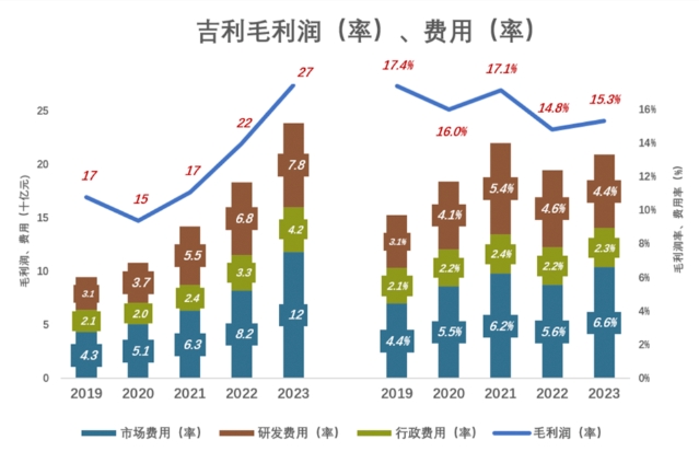 吉利汽车盈利能力下降的表面原因是——毛利润率上不去、费用率下不来,根源是销量增长缓慢,难以实现规模经济。