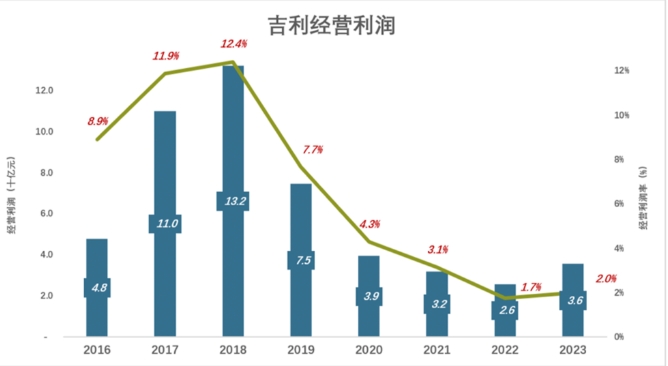 2018年,吉利经营利润冲高到132亿、利润率12.4%;