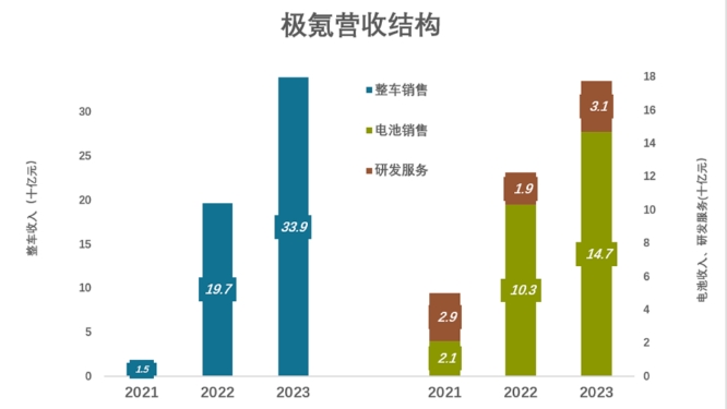 但2023年极氪销量仅为特斯拉的6.6%,毛利润率只比特斯拉低2个百分点,说明极氪借了集团的力(2023年吉利汽车销量达168.7万辆)。