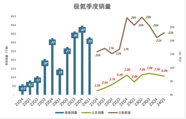 2023年Q4,极氪销量接近4万辆、同比增长22.1%;占吉利总销量的7.5%,占吉利新能源车销量的21%。