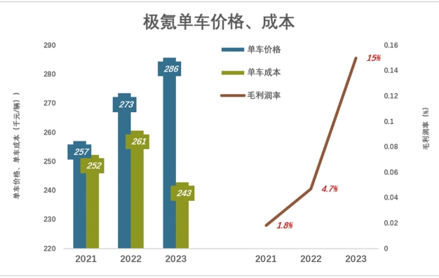 2023年,极氪销量接近12万,单车均价28.6万、单车成本24.3万,单车毛利润4.28万元,毛利润率15%。