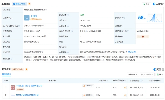 股东信息显示,该公司由中核汇能(四川)能源有限公司(持股80%)、东方电气风电股份有限公司(持股20%)合资成立。