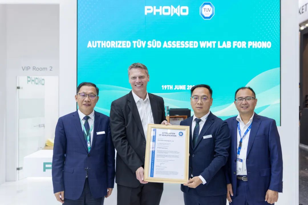 2024年6月19日,慕尼黑Intersolar光伏展期间,苏美达能源旗下品牌辉伦太阳能再次获得TÜV南德意志集团(以下简称“TÜV 南德”)颁发的WMT实验室资质证书。此项认证标志着苏美达辉伦产品一如既往的品质保证,并成功实现了苏美达辉伦实验室IEC新标准的扩项目标。TÜV南德意志商业产品全球负责人高级副总裁Wolfgang Hübl,TÜV南德意志大中华集团智慧能源副总裁许海亮,苏美达能源党总支书记、董事长郭宏伟,党总支副书记、总经理仲在峰出席颁发仪式。