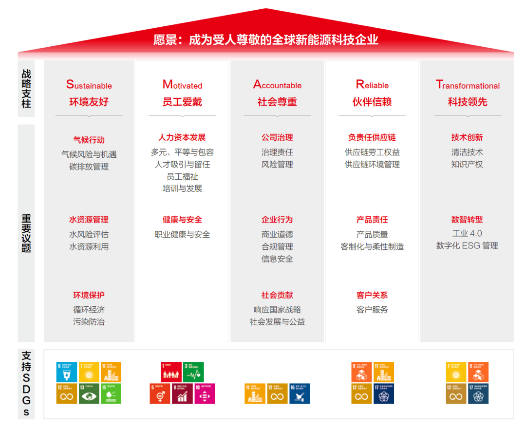 我们坚持可持续发展理念,制定了以“成为受人尊敬的全球新能源科技企业”为愿景的“SMART”可持续发展战略,围绕“环境友好”“员工爱戴”“社会尊重”“伙伴信赖”“科技领先”五大战略支柱,采取多元化策略和有力措施,并设立了系统、可衡量且具体的长期目标,将ESG理念全面融入公司战略规划、决策制定与执行过程中,推进全球ESG领先标杆建设,打造与全球化商业模式相适应的可持续竞争力。