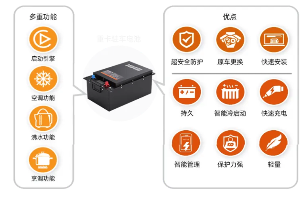 南都驻车智能锂电兼具启动和驻车功能,容量最高可达280Ah,储电量是传统铅酸电池的2至3倍,能满足卡车司机10小时的用电需求,使用寿命达五年以上,远高于传统电池的10个月。24V的标称电压与铅酸电池兼容适配,有效避免更换锂电后,电量无法充满的问题。