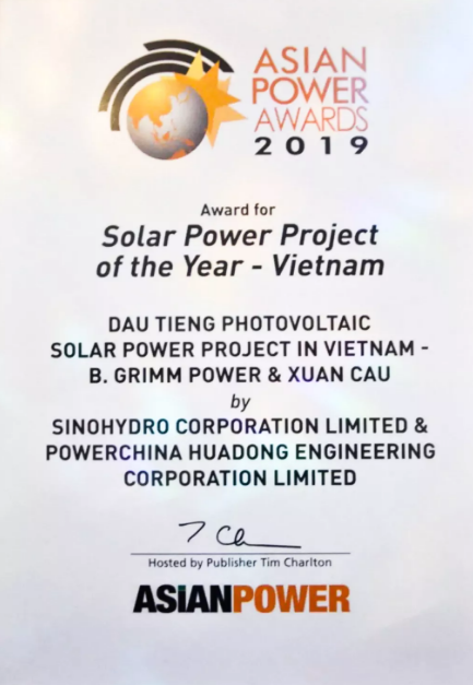 由华东院总承包的越南油汀光伏电站项目获颁亚洲能源"2019年度越南优质光伏电站项目"奖项。颁奖典礼在马来西亚吉隆坡举行,电建国际公司总经理助理、亚太区域总部副总经理叶浩亮领取奖牌。华东院亚太区域总经理、油汀项目经理邹晗和项目常务副经理孙子元参加授奖典礼。