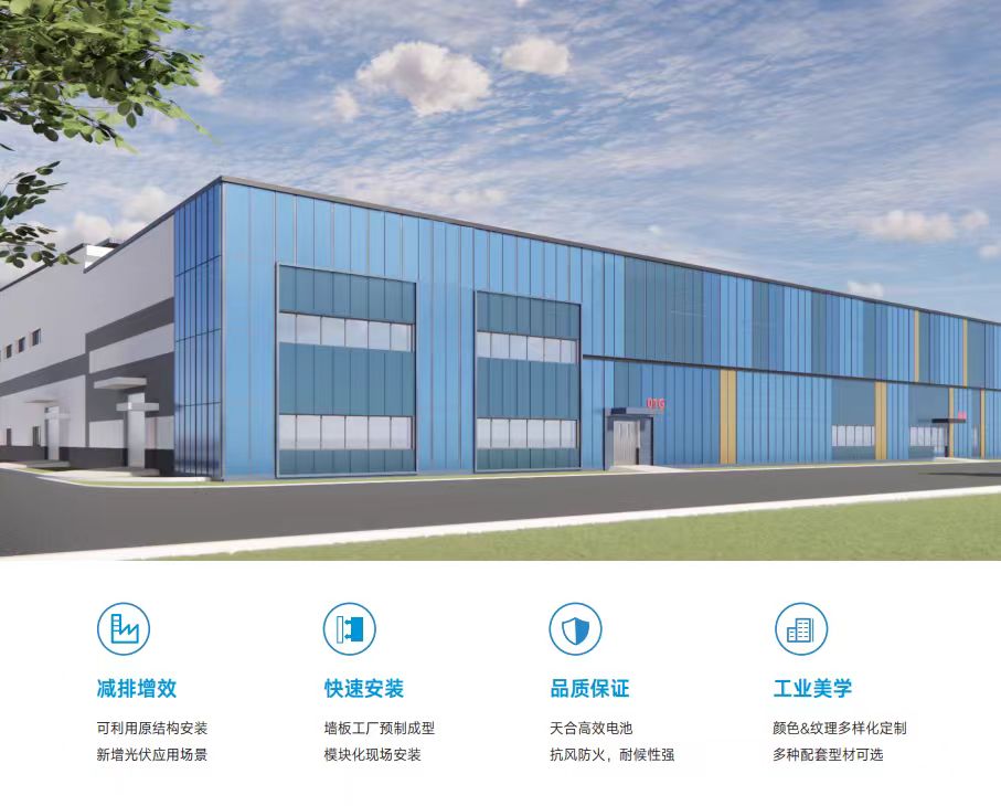 产品采用天合TOPCon电池技术,最高可达195~205Wp/㎡;产品作为光电建材,将太阳能转换成电能,为建筑提供绿色能源,减少建筑能耗,助力高性能建筑。