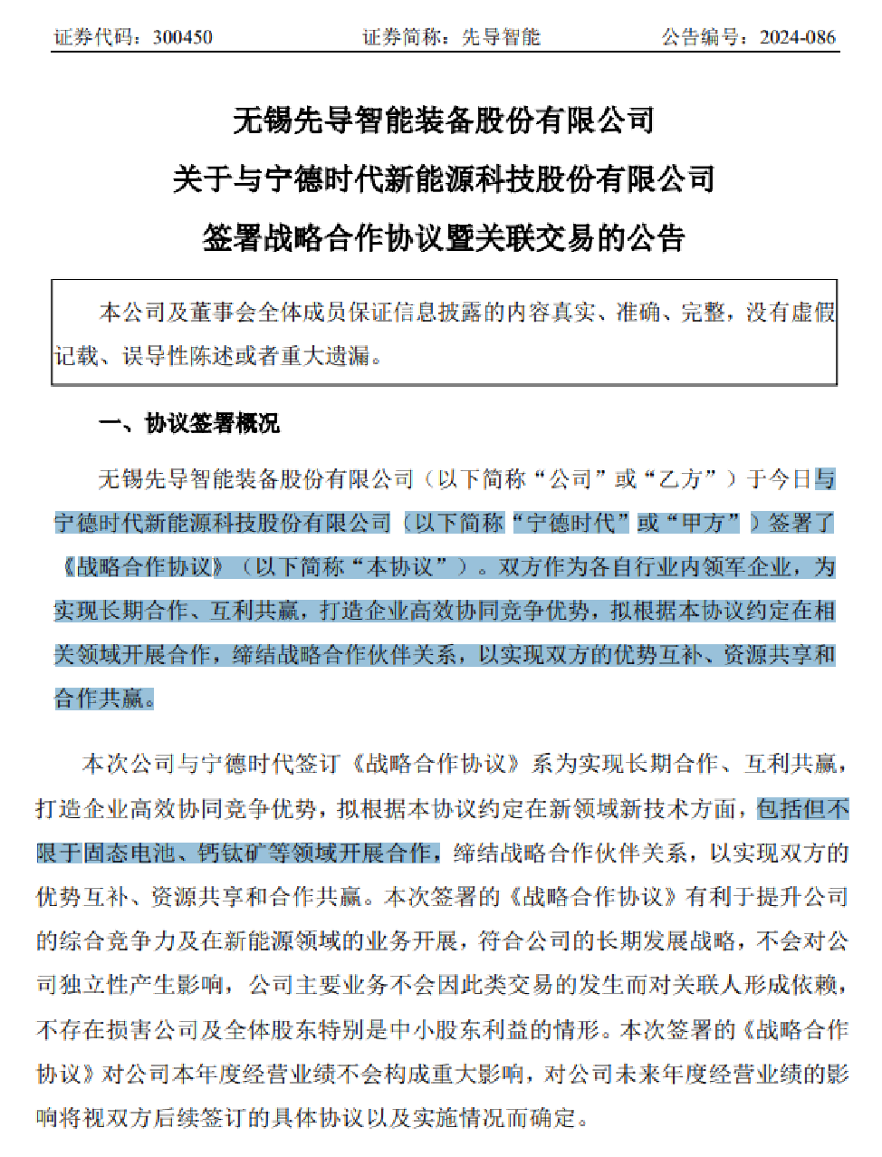 据介绍,先导智能与宁德时代拟根据签订的《战略合作协议》约定在新领域新技术方面,包括但不限于固态电池、钙钛矿等领域开展合作,缔结战略合作伙伴关系,以实现双方的优势互补、资源共享和合作共赢。