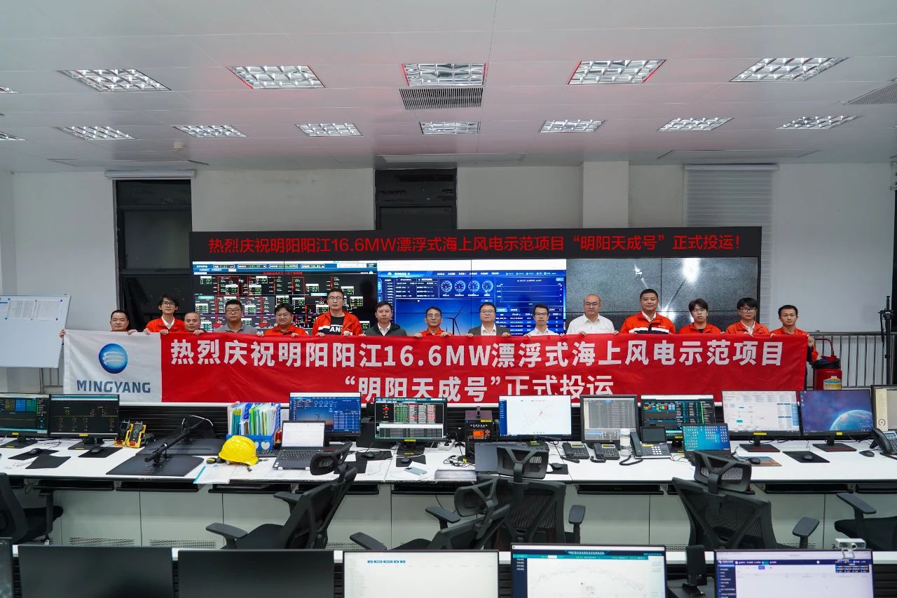 “明阳天成号”由明阳集团自主研制,为全球首次在一个浮式基础上搭载两台8.3兆瓦海上风机,总装机容量达到16.6兆瓦,是目前全球最大的漂浮式风电平台,平台排水总量约1.5万吨,投运于离岸约70公里、水深约45米的明阳阳江青洲四海上风电场,预计每年可提供约5400万度绿色电力,能满足3万户三口之家一年的日常用电需求。