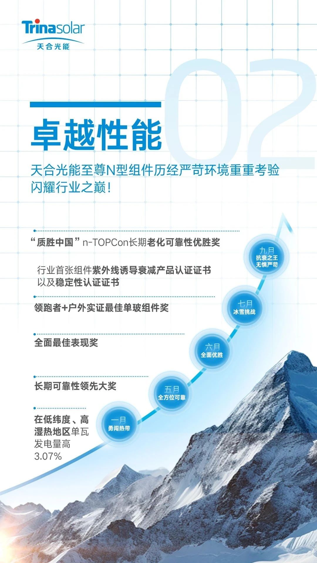 天合光能始终走在n型技术发展的前沿,自主研发的i-TOPCon技术不断刷新记录,其至尊N型组件经过多重严苛考验,可靠性能始终优异。