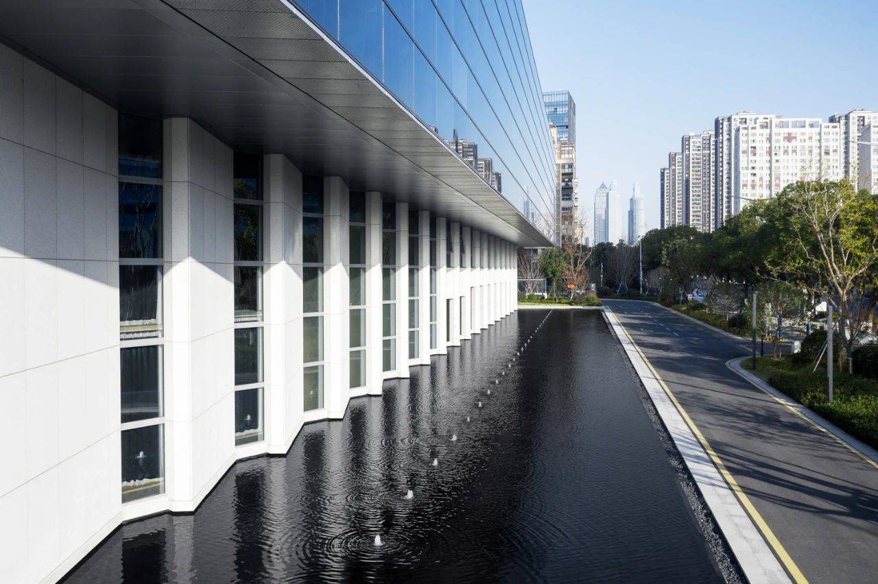 景观的巧妙布局,赋予园区蓬勃的生命力。入口处,黑色镜面水池线条简洁、色调沉稳,与建筑科技感呼应。