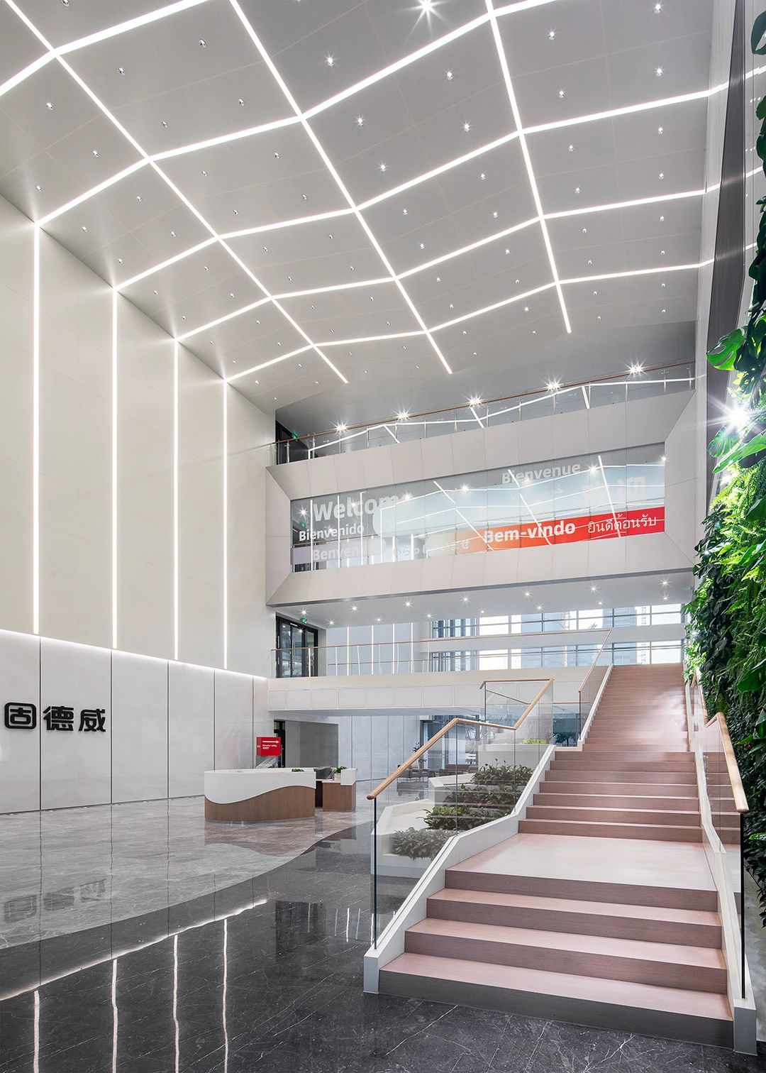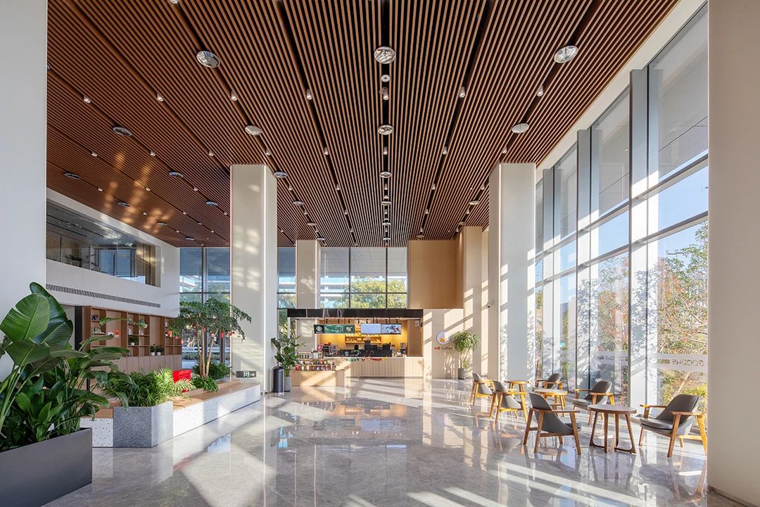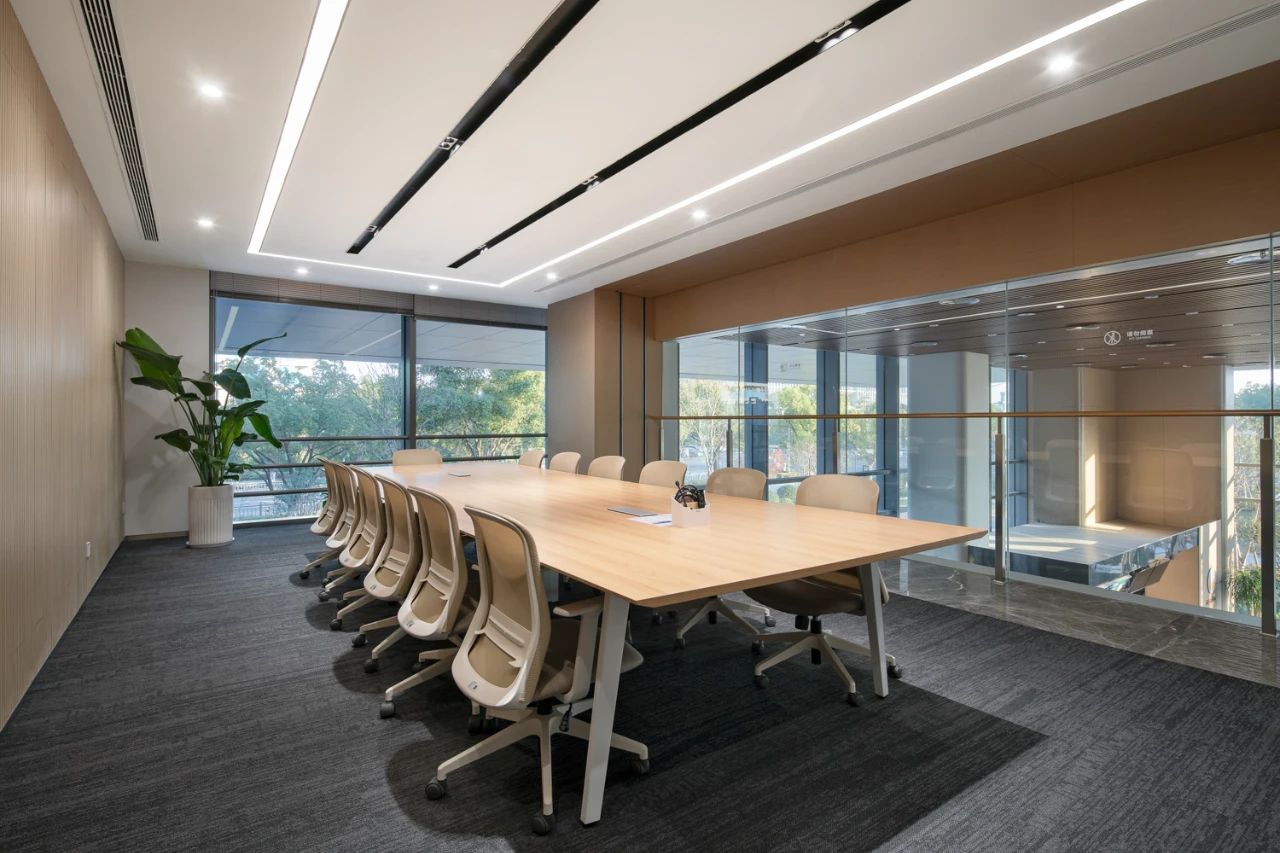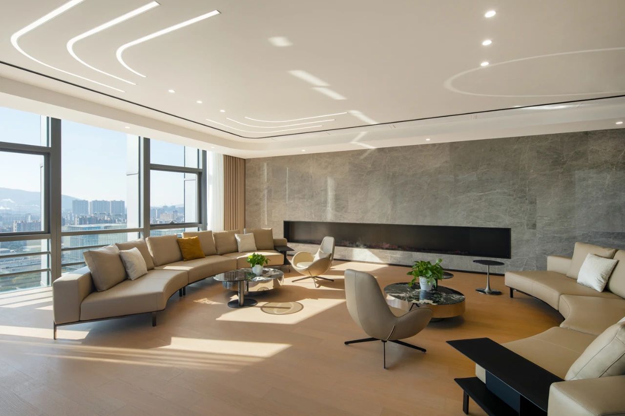 公共空间挑高十分充裕,浑然一体的线条光,引入青翠的绿植点缀其中,以此打造一个亲生物的高端接待空间。也让置身其中的人们最大程度的感受人与自然的链接,消除人与人之间的距离感。