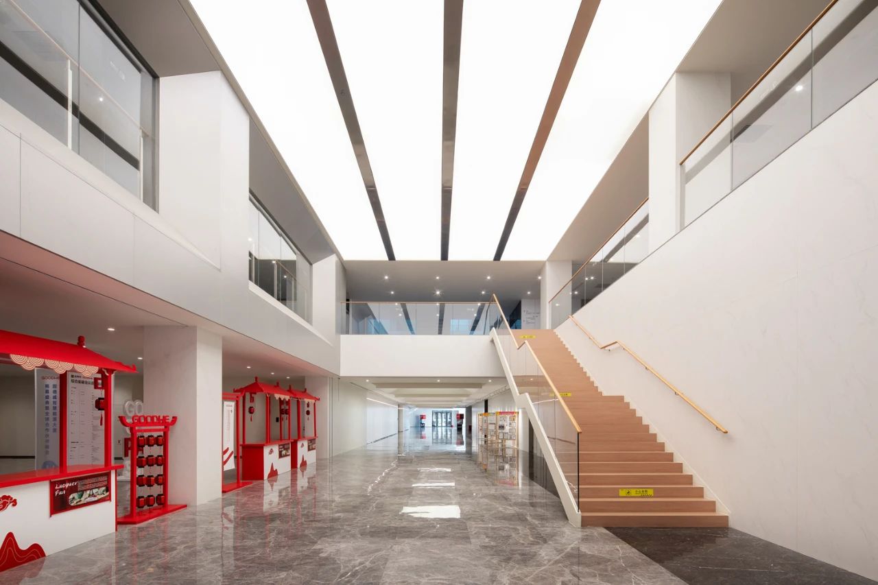 室内空间围绕“未来、科技、环保、可持续”的关键词,把概念抽象化转译后应用到空间的设计语言中,通过对材料语言和空间形态的精简,打造“简洁、智能、动静结合”的复合型空间,体现固德威绿色环保理念。