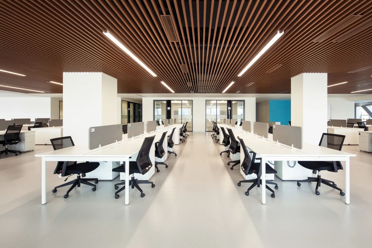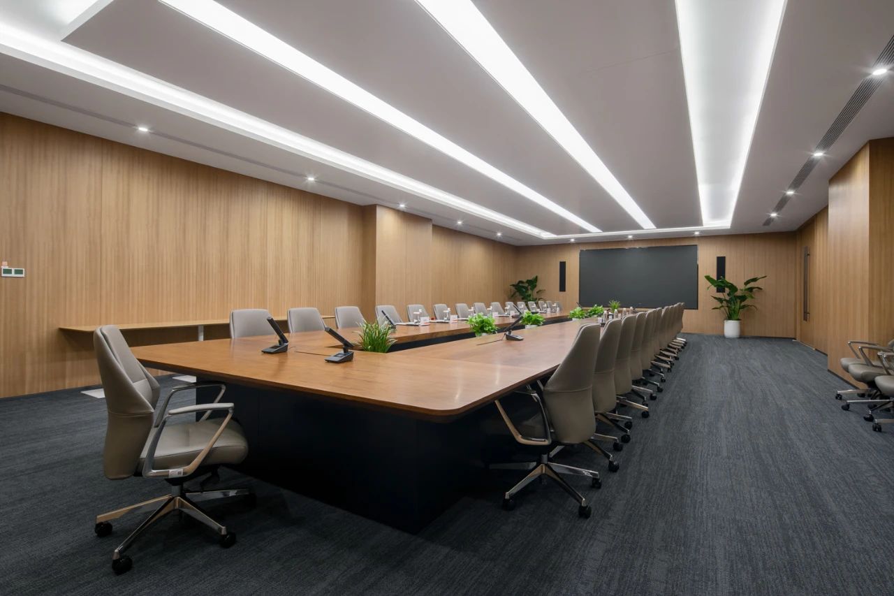 开放式办公区域,秉持极致简约与精致并存的理念,摈弃过多的装饰,少种类、色调统一的材料选择与光合二为一,深色金属成为整个空间的重色,在光影的构成下实现简约大方、沉稳宁静的办公氛围,凸显总部气质。