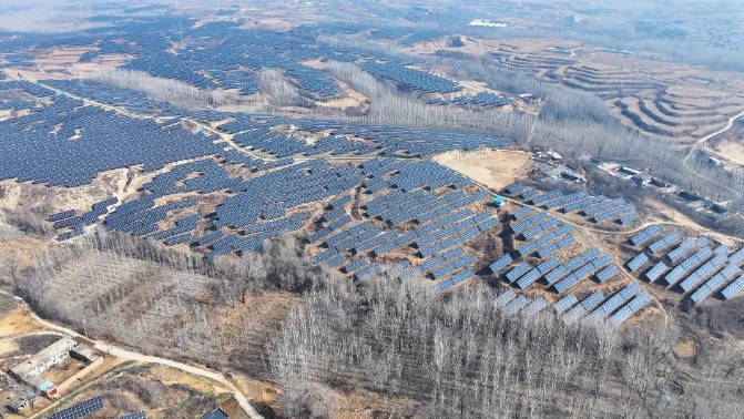 无人机掠过太行山脉,一排排光伏板正随着山势的起伏铺展开来。曾经植被稀疏的荒山坡地,如今已蜕变成为兼具发电与生态价值的“绿色银行”。