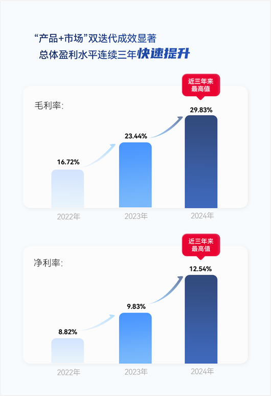 从经营质量看,公司盈利增速强劲:连续3年毛利率、净利率双增。其中:毛利率、净利率连续三年持续提升,2024年实现毛利率29.83%,同比提升6.59个百分点;实现净利率12.54%,同比提升2.71个百分点。