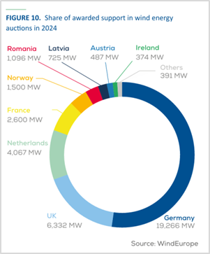 欧洲海风市场拍卖增速背景下,大金重工订单增速未来可期根据WindEurope发布的海上风电市场拍卖数据:2024年,欧洲海上风电项目累计拍卖总量36.8GW(德国授予的容量最多,达19GW,其次是英国的6.3GW和荷兰的4.1GW),创下年度核准量历史新高;其中:海风占比超过半数,达到20GW,同比增长46.3%。