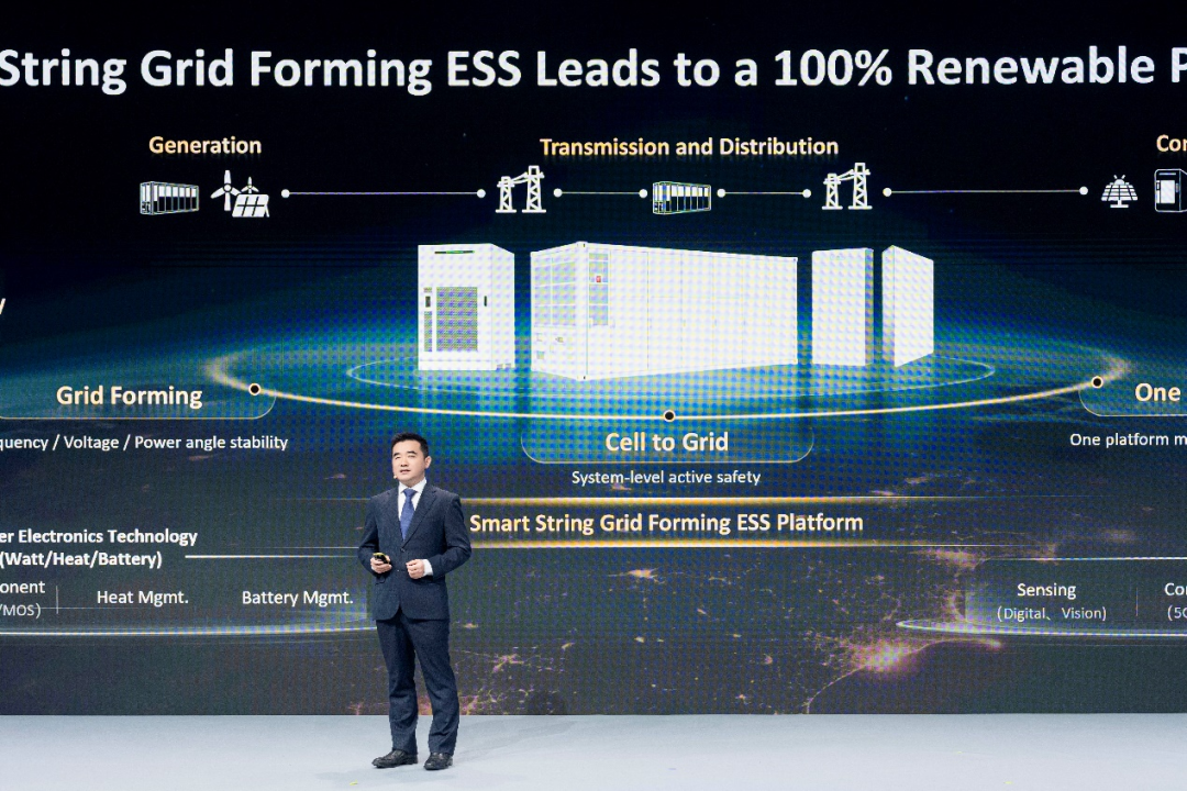 华为数字能源构网型储能领域总裁郑越发布了新一代全场景智能组串式构网型储能平台,包含电站和工商业智能组串式构网型储能新品。针对目前高比例可再生能源对电网稳定性带来的挑战、储能安全等行业普遍面临的问题,华为以全场景构网、从芯到网安全、全生命周期经济、全链路数字化的智能组串式构网型储能平台,定义构网能力的黄金标准:构网型储能应具备贯穿电力系统发输配用全场景、全工况、全生命周期的构网能力。