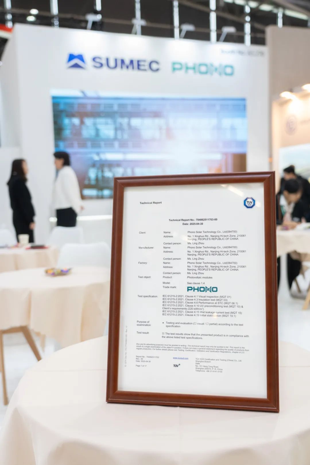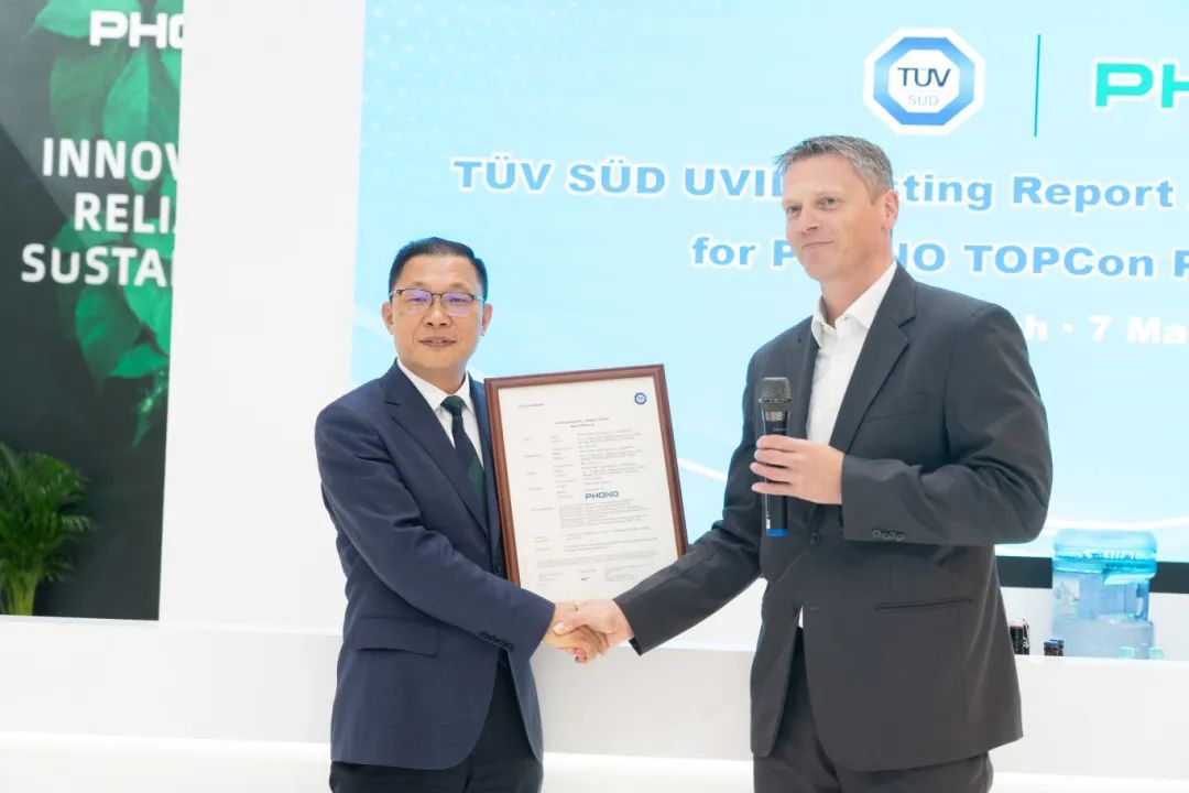 2025年5月7日,苏美达能源旗下品牌辉伦太阳能在Intersolar Europe展会现场,正式获得了TÜV南德颁发的UVID测试通过报告,标志着苏美达辉伦光伏组件在质量与可靠性领域的技术实力再上新台阶。TÜV南德商业产品全球负责人高级副总裁Wolfgang Hübl,TÜV南德意志大中华集团智慧能源副总裁许海亮,苏美达能源党总支副书记、总经理仲在峰出席颁发仪式。