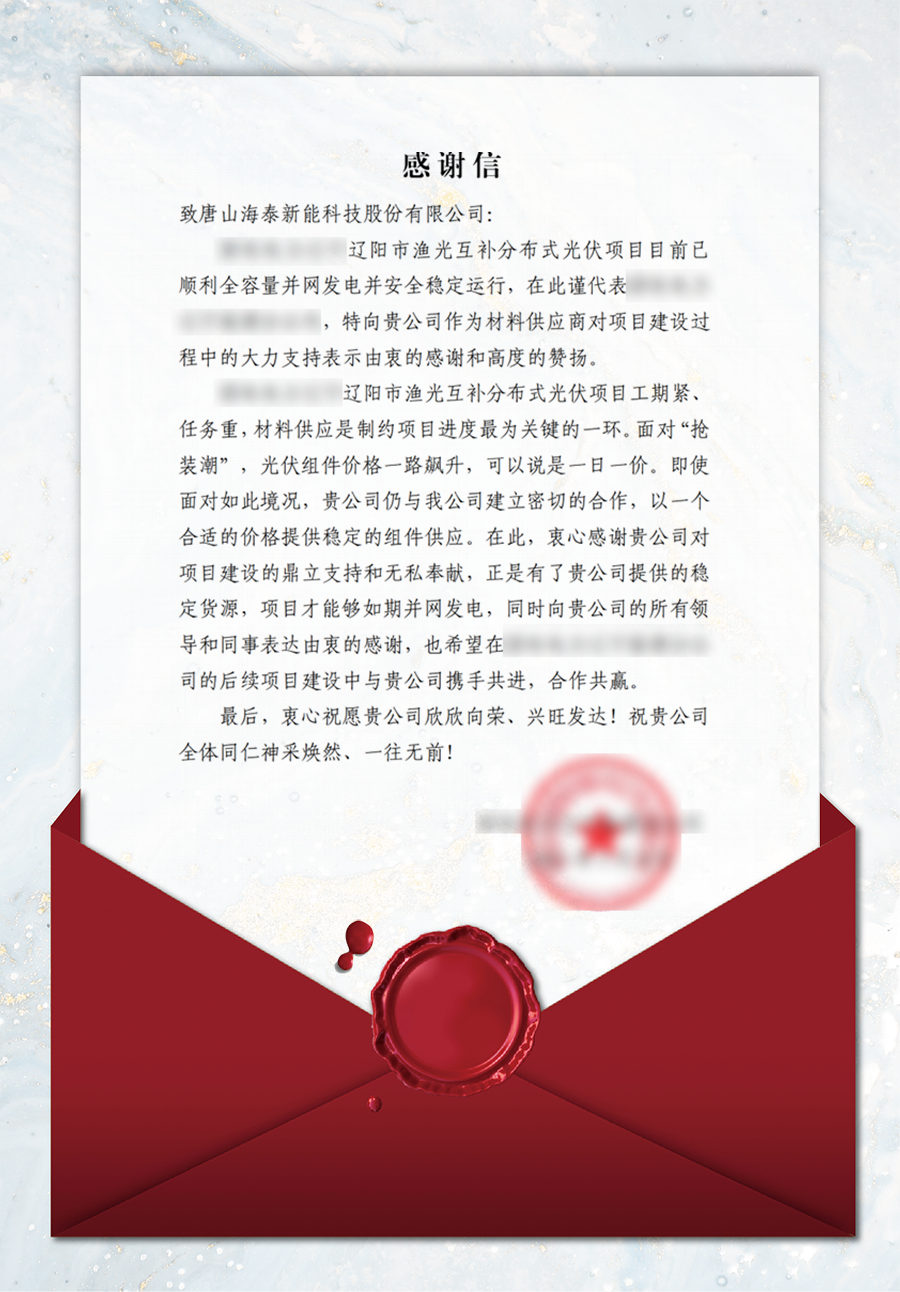 近期,基于海泰新能在辽阳市渔光互补分布式光伏项目中展现出的专业精神,业主单位致信感谢并予以高度赞许,期待保持紧密合作,携手共赢。
