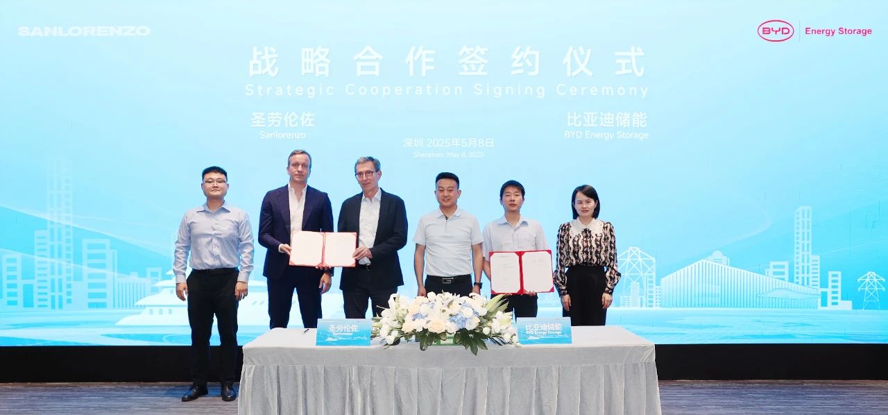 2025年5月8日,比亚迪储能与圣劳伦佐集团(简称“圣劳伦佐”)在深圳坪山比亚迪总部举行战略合作签约仪式。圣劳伦佐首席创新官Paolo Bertetti、圣劳伦佐集团采购总监Damiano Vincenzo Patelli,比亚迪储能及新型电池事业部总经理尹小强、新型应用产品线总监姜新军等出席签约仪式。