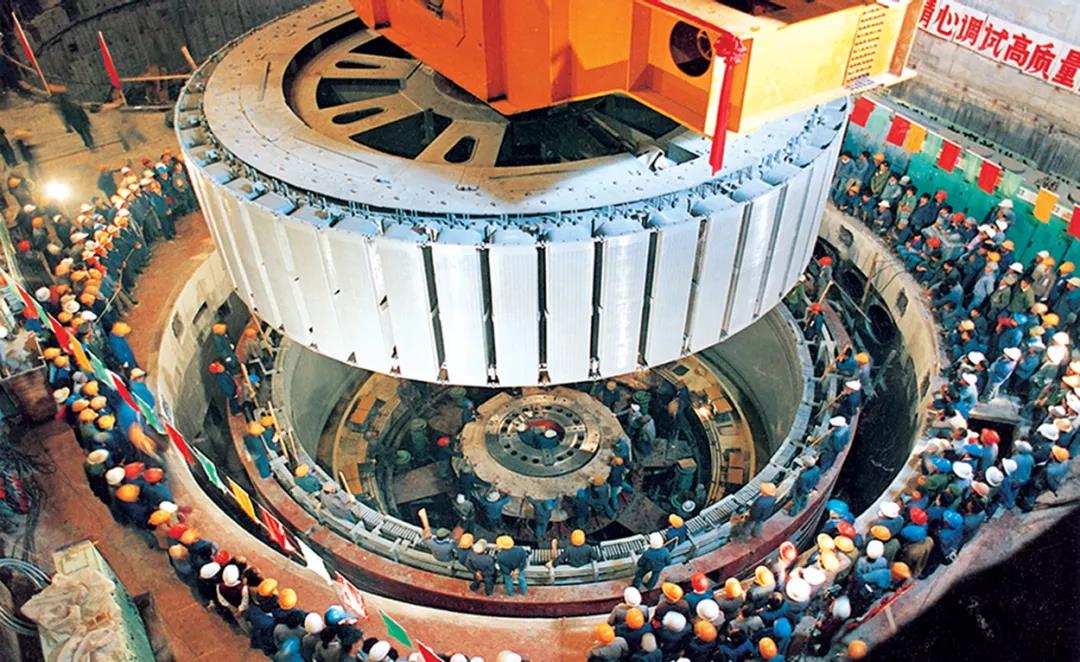 龙羊峡水电站第一台320兆瓦发电机转子吊装