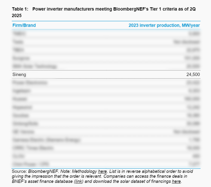 近日,全球权威新能源研究机构彭博新能源财经(BloombergNEF)公布了2025年第二季度全球一级光伏逆变器制造商榜单(BNEF Tier 1)。作为全球领先的构网型光储解决方案供应商,上能电气连续七个季度荣登该榜单,持续展现强劲的综合实力与全球市场影响力。