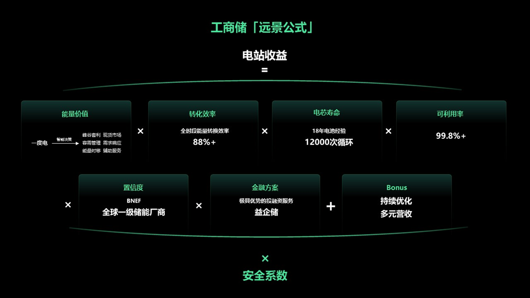 助力实现“Win-Win稳盈”的工商储远景公式:电站收益= 【能量价值×转化效率×SOH×可利用率×置信度×(1–利息)+ Bonus】×安全系数