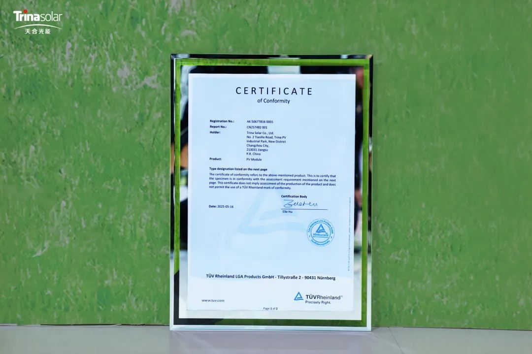IEC TS 63209-1作为光伏组件“极限挑战”的国际标准,模拟极端环境应力,如高温循环、湿热老化、机械载荷等,验证组件长期可靠性。该项认证不仅是对技术实力的认可,更是一张赋予产品在全球极端气候中稳定运行的“品质通行证”。天合光能至尊N型中、大版型和极御组件同时顺利通过TÜV莱茵和TÜV北德的IEC TS 63209-1扩展应力测试,是对其能在实际应用中实现稳定输出、高效发电的佐证,更彰显出天合光能扎实的研发功底与严苛的品控体系。未来,天合光能也将持续以标准为锚、以技术为翼,推动光伏组件向更可靠、更高效进阶。