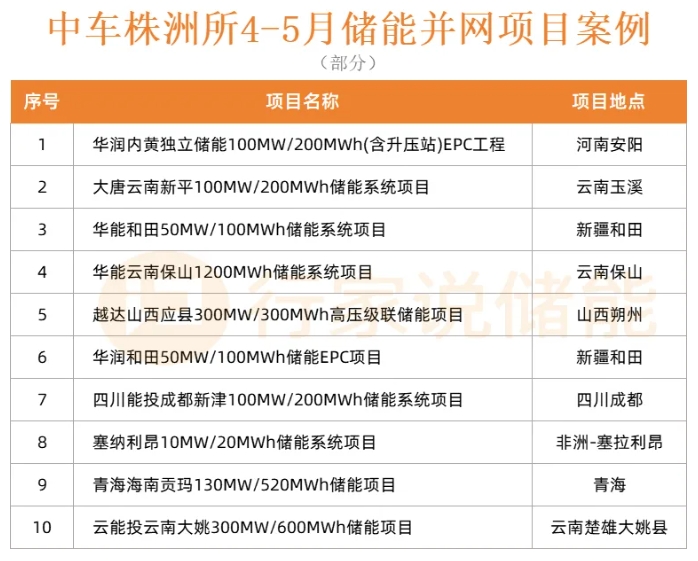 根据行家说储能统计的4-5月全国储能并网数据,中车株洲所并网储能项目功率占比达33.95%,容量占比达27.22%。这一领先的市场份额,主要得益于中车株洲所在储能领域强大的市场拓展与拿单能力。