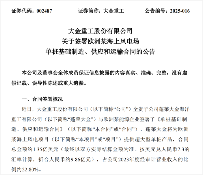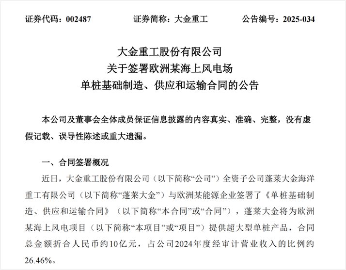 今年以来,大金重工陆续公告供应欧洲海上风电市场的单桩基础项目订单,累计金额约20亿人民币。