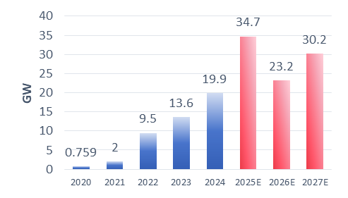 根据 4C offshore 报告显示,预计 2025-2027 年,欧洲海上风电项目拍卖量将继续保持增长态势:2025 年 34.7GW、2026 年23.2GW、2027 年 30.2GW。
