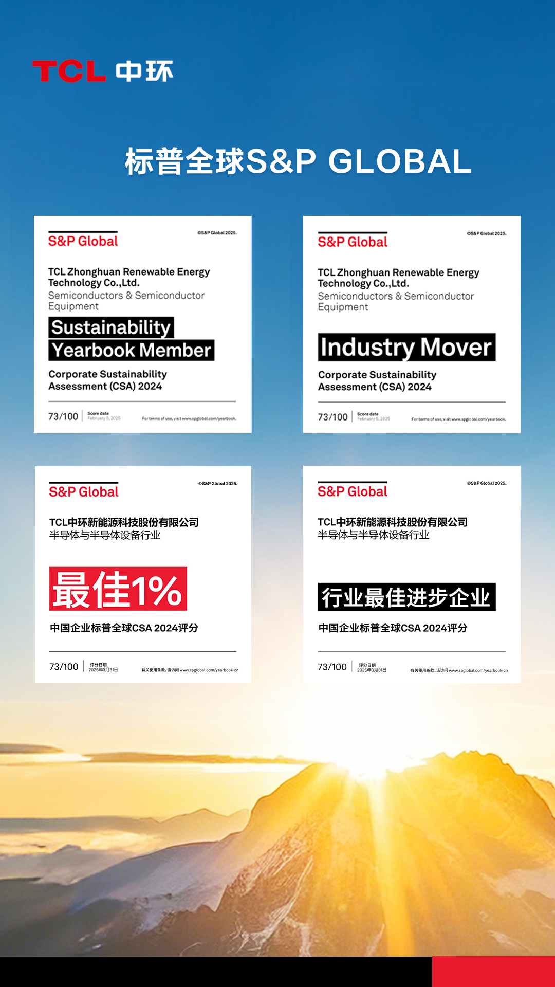 凭借在可持续发展领域的战略布局和卓越表现,TCL中环也收获了多项殊荣。在2024年标普全球“企业可持续发展评估(CSA)”中,TCL中环获得了73分的优异成绩,位列全球光伏行业TOP1,入选标普全球《可持续发展年鉴2025》,获颁行业最佳进步企业,并作为唯一光伏企业被评为中国企业标普全球CSA评分最佳1%;入选商道融绿《中国企业ESG领先者报告2025》。