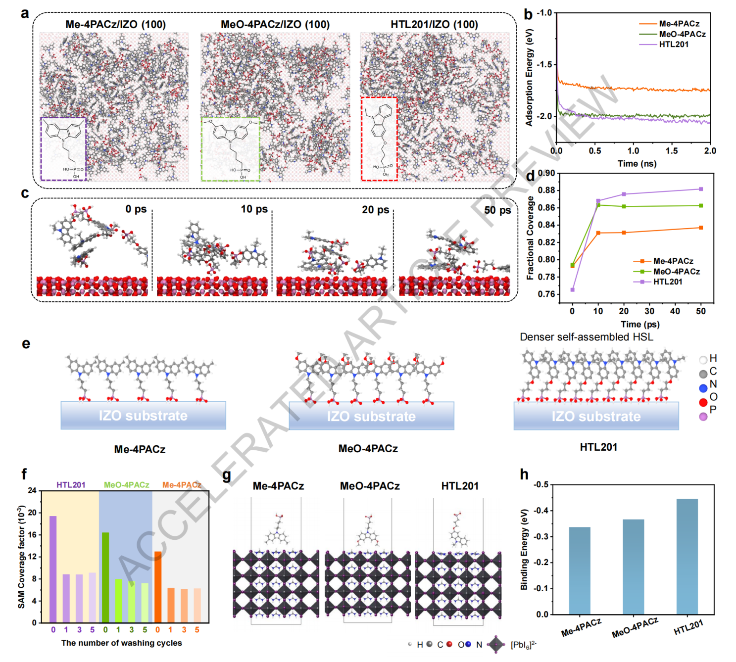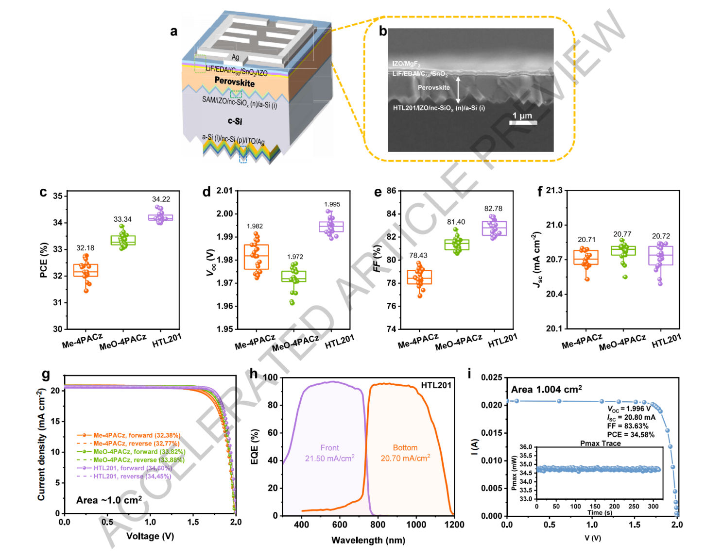 针对空穴传输层所在的界面复合问题,隆基团队联合苏州大学开展研究,在新型有机自组装分子材料(SAM)设计及晶硅-钙钛矿叠层器件取得了突破性进展。有别于传统的SAM材料在咔唑的氮原子上引入膦酸锚定基团,研究人员在咔唑核的苯环侧引入膦酸锚定基团,提出了一种具有非对称结构的自组装分子(HTL201),作为宽带隙钙钛矿子电池的空穴选择层。非对称结构的引入显著增强了SAM的锚定能力,原位提升了SAM在硅绒面衬底的覆盖率及均匀性,优化了界面能级匹配。同时,HTL201与钙钛矿之间的强相互作用促进了高品质钙钛矿薄膜的沉积,并有效钝化了埋底界面缺陷,显著降低了表面界面非辐射复合水平。通过与双面纹理化的异质结晶硅结合,研究团队成功实现了开路电压接近2.0V,且认证效率高达34.6%的晶硅-钙钛矿串联叠层太阳电池。这项研究为新型SAM材料的开发及进一步提升晶硅-钙钛矿叠层效率提供了重要的技术方案。相关研究成果2025年7月7日以“Efficient perovskite/silicon tandem with asymmetric self-assembly molecule”为题,发表于国际顶级学术期刊《Nature》上。
