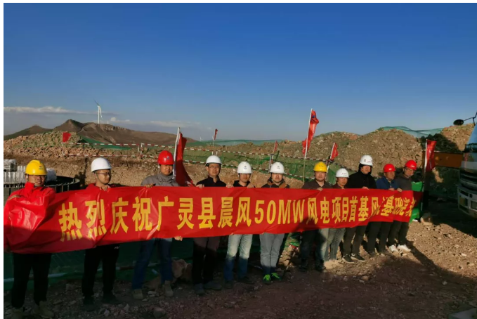 广灵县晨风50MW风电项目首台风机基础浇筑的顺利完成,是公司各部门及各级参建单位密切配合及共同努力的结果,有力的推动项目各级分项工程、分部工程的有序进行的同时增强了项目各参与方人员的信心,鼓舞了团队士气,为实现2020年12月30日全容量并网的项目目标夯实了基础。
