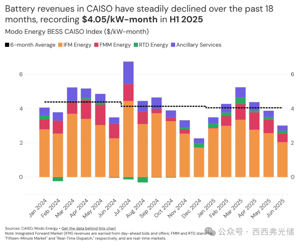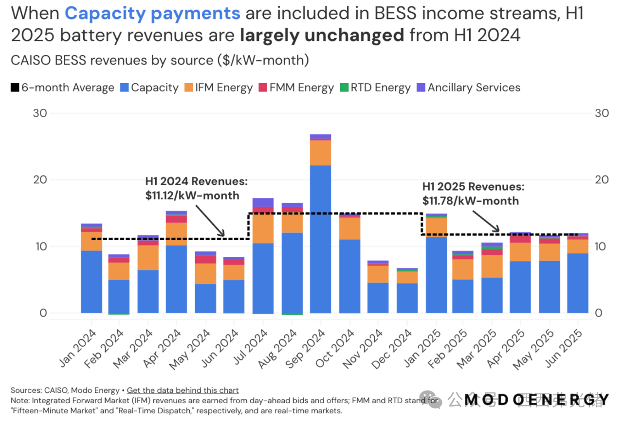 尽管能量套利仍然是CAISO储能收入的主要来源(约占90%),但其收入结构更具韧性。2025年上半年,虽然商业市场平均收入下降了7.7%,但容量电价收入的增长(从6.73/kW−月增至6.73/kW-月增至6.73/kW−月增至7.74/kW-月)弥补了这一缺口,使得总平均收入同比增长了6%。此外,实时调度(Real-Time Dispatch)贡献的收入份额从0.5%增长到5%,显示出新的收入增长点。